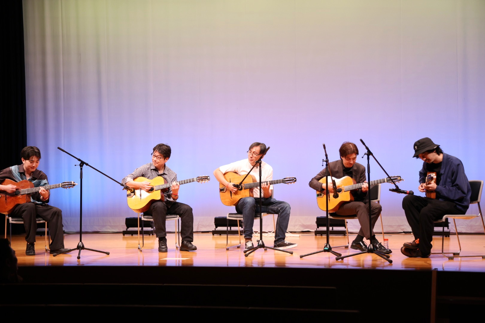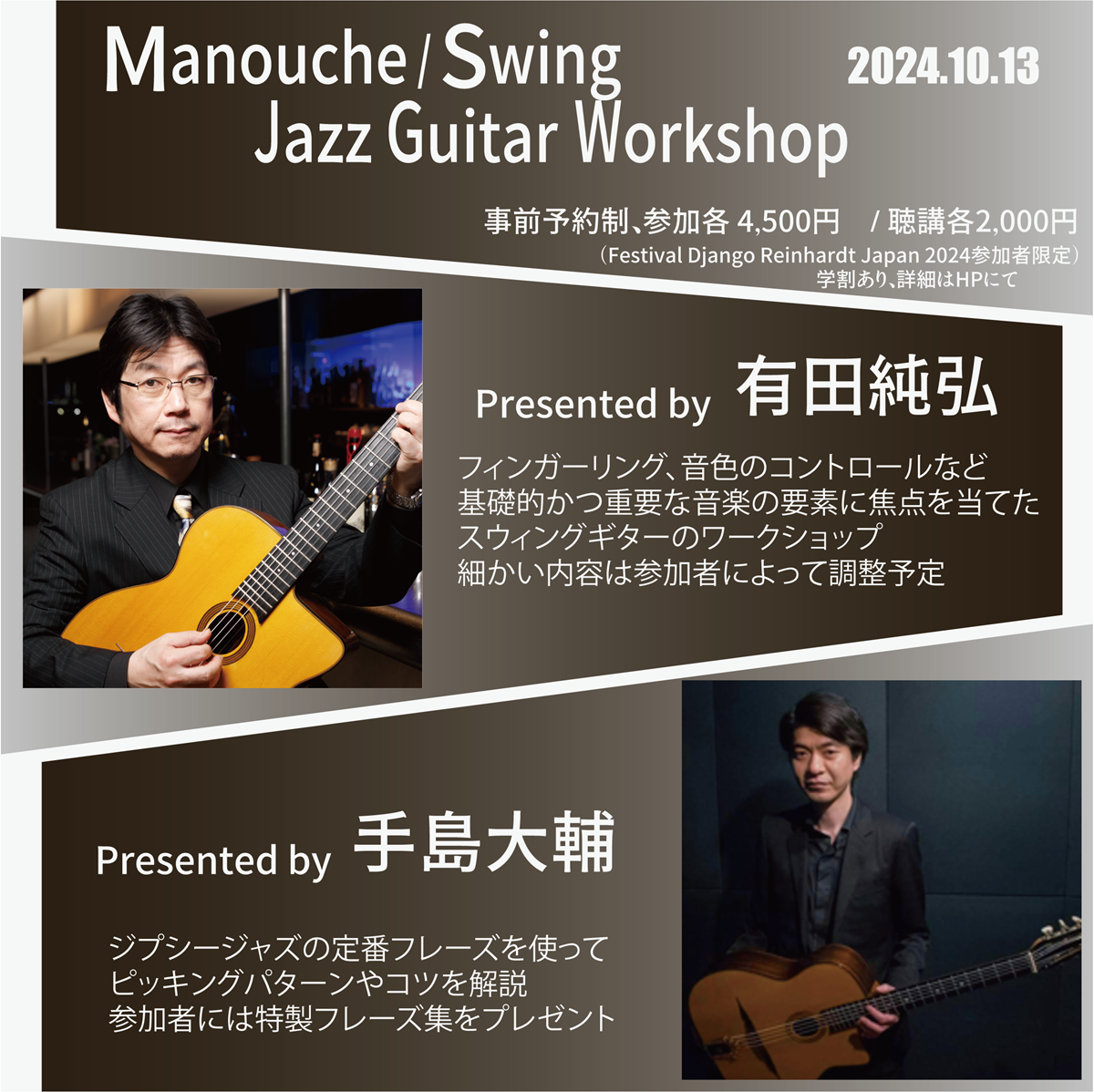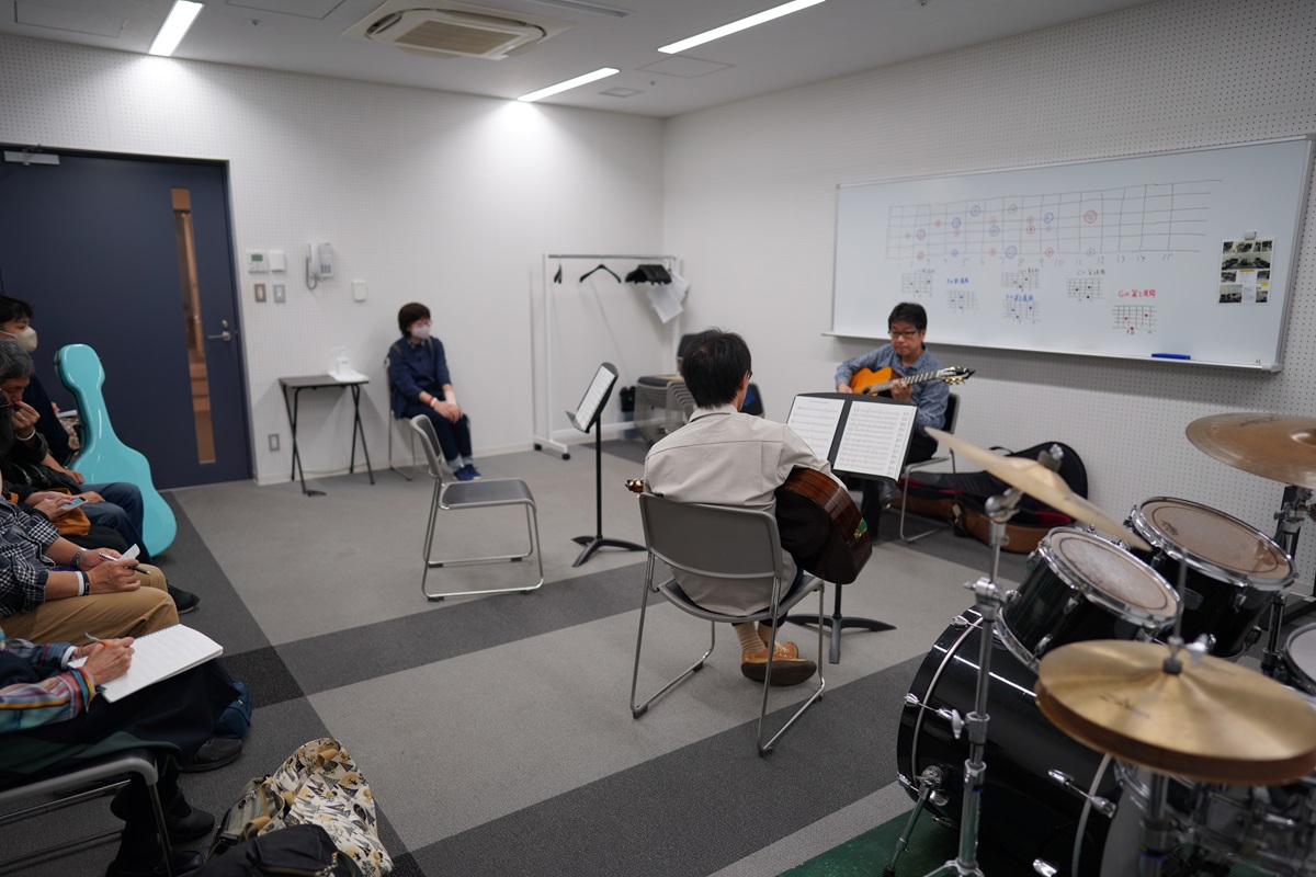 有田純弘氏、手島大輔氏によるギターワークショップ、開演前から終演までのずーとセッションを音楽室1,2にて同時開催